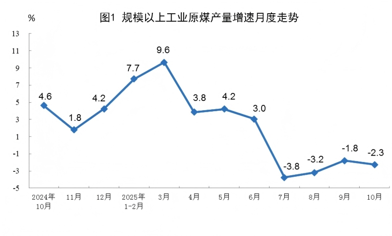 原煤生产保持较高水平。10月份,规上工业原煤产量4.1亿吨,同比下降2.3%;日均产量1312万吨。