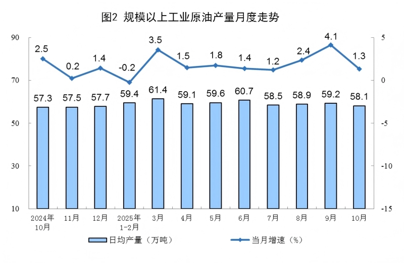 原油生产保持增长。10月份,规上工业原油产量1800万吨,同比增长1.3%,增速比9月份放缓2.8个百分点;日均产量58.1万吨。