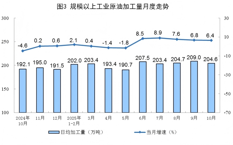 原油加工平稳增长。10月份,规上工业原油加工量6343万吨,同比增长6.4%;日均加工204.6万吨。