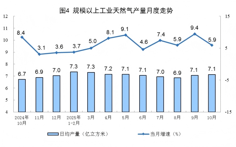 天然气生产增速放缓。10月份,规上工业天然气产量221亿立方米,同比增长5.9%,增速比9月份放缓3.5个百分点;日均产量7.1亿立方米。