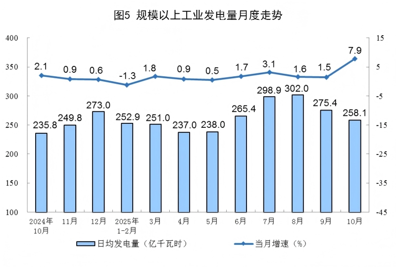 规上工业电力生产增速加快。10月份,规上工业发电量8002亿千瓦时,同比增长7.9%,增速比9月份加快6.4个百分点;日均发电258.1亿千瓦时。1—10月份,规上工业发电量80625亿千瓦时,同比增长2.3%。